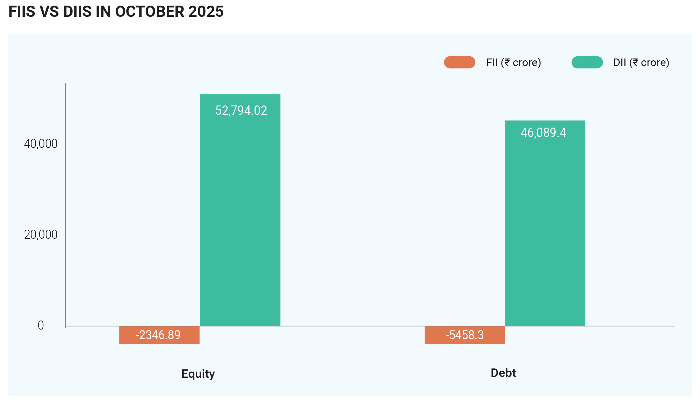 Despite these headwinds, the broader narrative remained optimistic. The resilience of PSU banks and strength in oil & gas counters reflected selective investor confidence in value sectors. The buoyant IPO market and steady mutual fund inflows pointed to deepening domestic participation. Both foreign and domestic investors played vital roles in sustaining the market’s strength. After several months of outflows, Foreign Institutional Investors (FIIs) returned as net buyers, while Domestic Institutional Investors (DIIs) maintained consistent support through steady inflows. This combined participation helped markets absorb volatility effectively. FIIs, who had been net sellers from July to September, reversed course in mid-October, recording their first positive monthly inflow since June 2025. They collectively purchased around ₹10,040 crore during the month, signalling renewed confidence in India’s macroeconomic prospects. The standout moment came on October 28, when FIIs logged their largest single-day purchase—over ₹10,300 crore—marking a decisive shift from the selling trend of previous months. DIIs remained steadfast, adding approximately ₹9,537 crore in net inflows by month-end. Their steady buying offset early volatility from FIIs and provided a stabilizing cushion during periods of profit-taking. FIIs particularly increased exposure to state-run banks, aligning with the PSU banking rally, while DIIs favoured financials and consumer-oriented sectors. The revival in FII sentiment was primarily driven by expectations of a potential U.S. Federal Reserve rate cut, moderation in the U.S. dollar, and resilient domestic earnings. Meanwhile, DIIs continued to deploy funds through systematic investment plans (SIPs) and tactical sectoral allocations. Together, these trends underscored renewed global and domestic confidence in Indian equities.