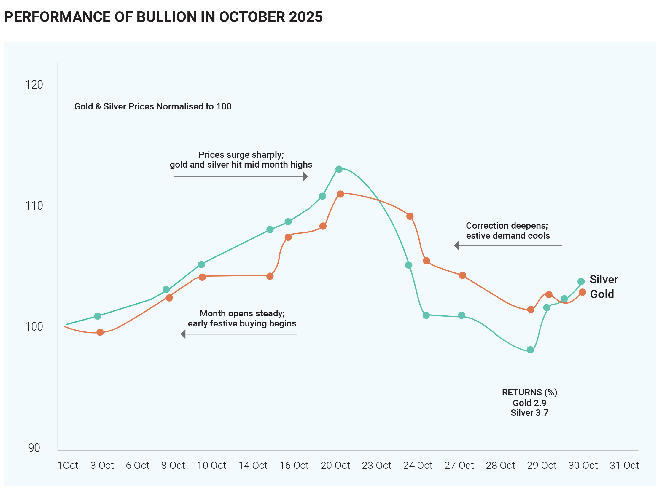 The rupee’s mild depreciation further added to the local price rise, as it made imported bullion more expensive. By mid-October 24-carat gold touched an all-time high of approximately ₹13,277 per gram, mirroring the global rally that saw international prices breach the $4,000 per ounce mark. The surge was underpinned not only by Indian festive buying but also by sustained central bank accumulation worldwide, as policymakers sought to diversify reserves amid economic and geopolitical uncertainties. However, the rally lost some steam in the second half of the month. As the festive fever cooled and global bullion prices corrected modestly, Indian traders engaged in profit booking. By the end of October, gold had stabilized around ₹12,200 per gram—still significantly higher than its early-month level, signalling resilient underlying demand. Overall, the month reaffirmed the strong seasonal influence of Indian consumers on gold prices and highlighted how global and domestic factors often converge to shape short-term trends in bullion markets.