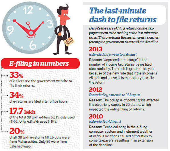 The surge in the number of e-filers on 31 July, the last day for filing income tax returns, overloaded the system and forced the government to extend the deadline to 5 August. This last-minute rush has become a regular feature in the past few years. The system gets overloaded because a large number of taxpayers wait till the last day. In the melee, many of them are unable to file by the due date. The rush is greater this year because of the new rule that if your taxable income is Rs 5 lakh and above, it is mandatory to e-file your return.